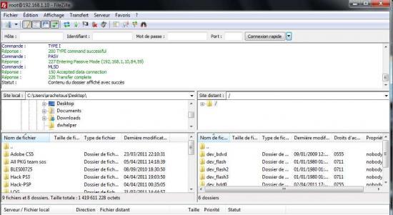 Launch Filezilla in the "Host" box: write the IP address given by OpenPS3FTP and the "Port" box put 21 in the box Login to: root / in the Password box set: openbox