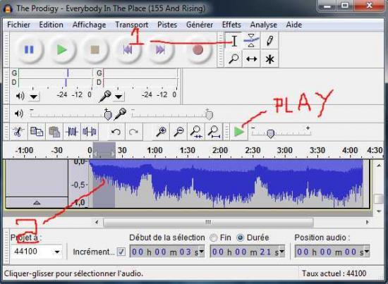 3 Once you open it in Audacity music will falloire choose your path from August to September dry (anyway even if it is too long then you will see modifira), then just click the selection tools ( 1 on the image below) and then double click the icon and then move your sound labarre which appear to select your song ( two on the picture below) then you can listen by clicking on the Play just above the bar, the play which is not all at the top.