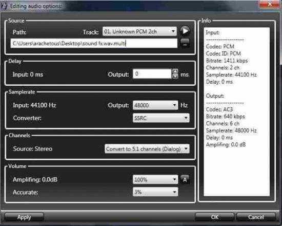 10 Made drag / drop your piece of music you have modified Audacity again in XviD4PSP, then go to Audio and Audio Editing and set the parameters exactly like the picture below, then in the box patch added the word " multi "in the name of your song and click Apply then OK